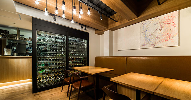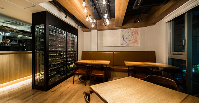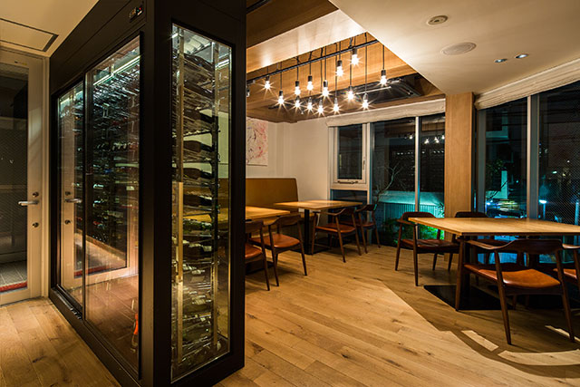 2Fは、上質なオーストラリアを感じられるレストランフロア。空間は落ち着いたオーク材で固め、大型のワインセラーや意匠性の高いペンダントライトを配灯しました。席数は少なめですが、落ち着いて季節のコースを味わえる空間となっています。