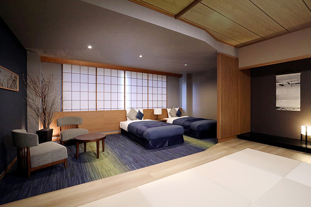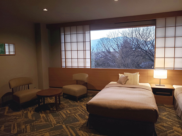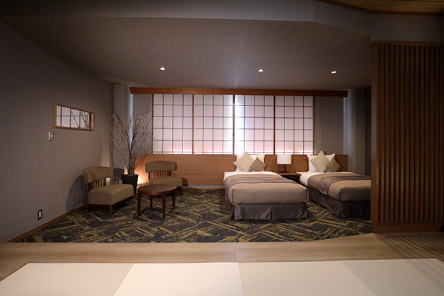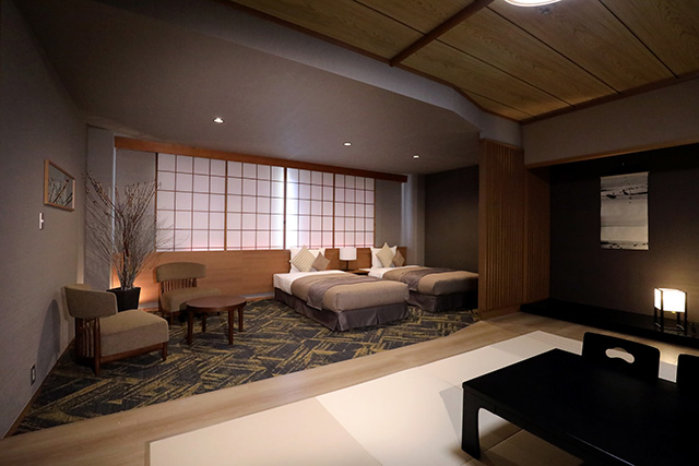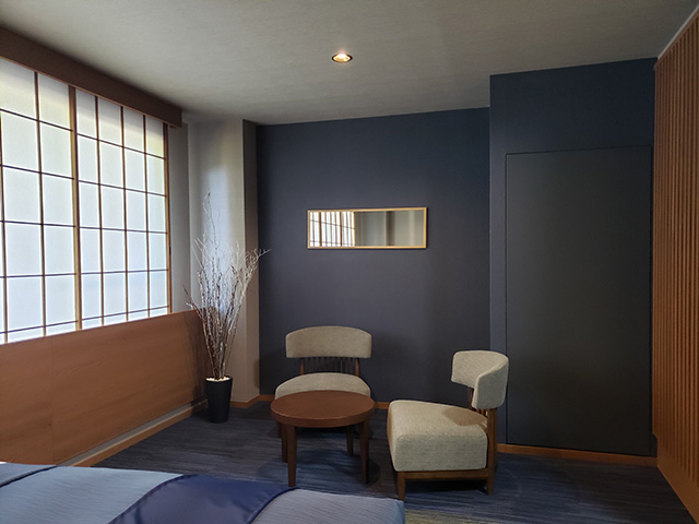 東館は浴場にもレストランにも近く、庭園を目のあたりにできる2 階、3 階でこの上ない位置にありますがデザイン的に一番落ちる狭い客室でしたので、東館10 部屋を和洋室としてデザインし、この2 月末にリニュ-アルオープンいたしました。